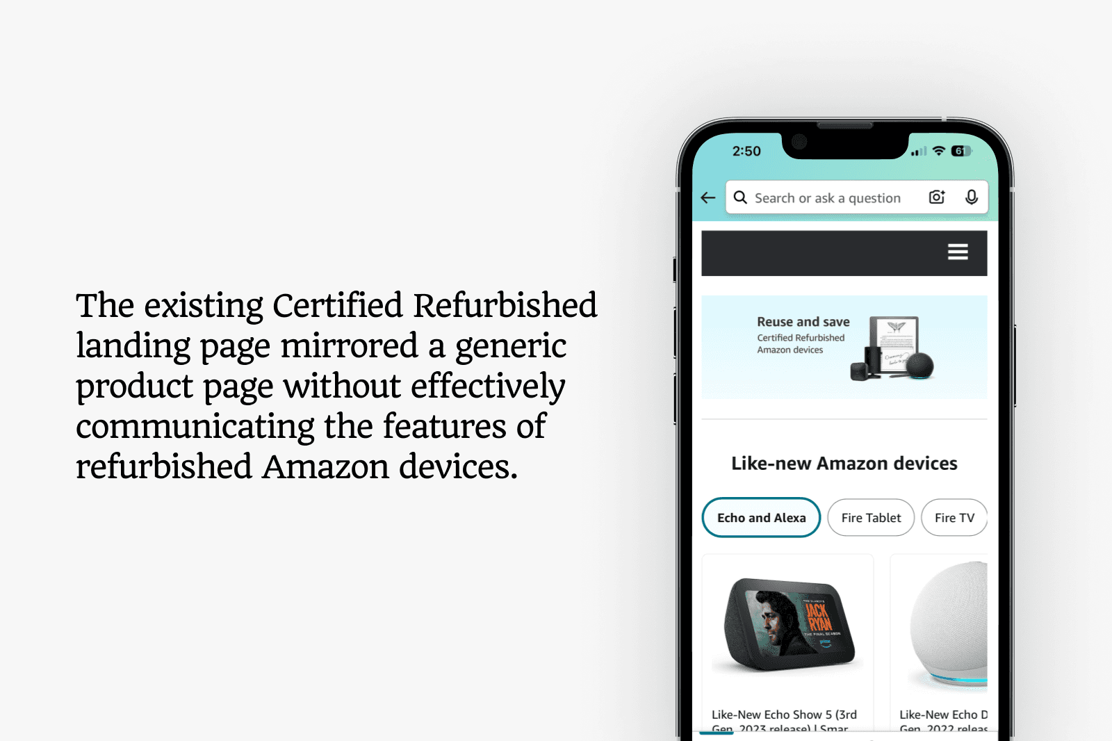 Amazon Certified Refurbished is an exclusive Amazon program dedicated to selling pre-owned devices made by Amazon—such as Echo, Kindle, and Fire TV products, that have been professionally inspected, tested, and restored to work like new. While the overall Certified Refurbished experience spans multiple touch-points, the scope of our work focused solely on the landing page. Our goal was to define a clear strategy for how the landing page could educate users and drive engagement with Amazon’s offerings.